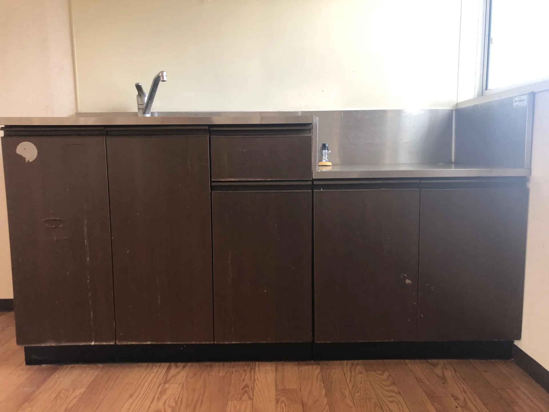 キッチンの扉や引き出しは汚れ・損傷が見受けられ、全体的に劣化が