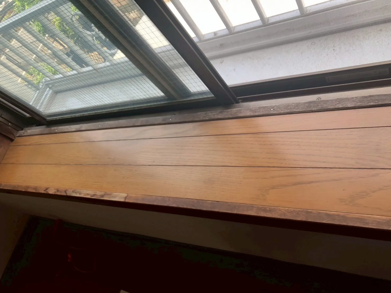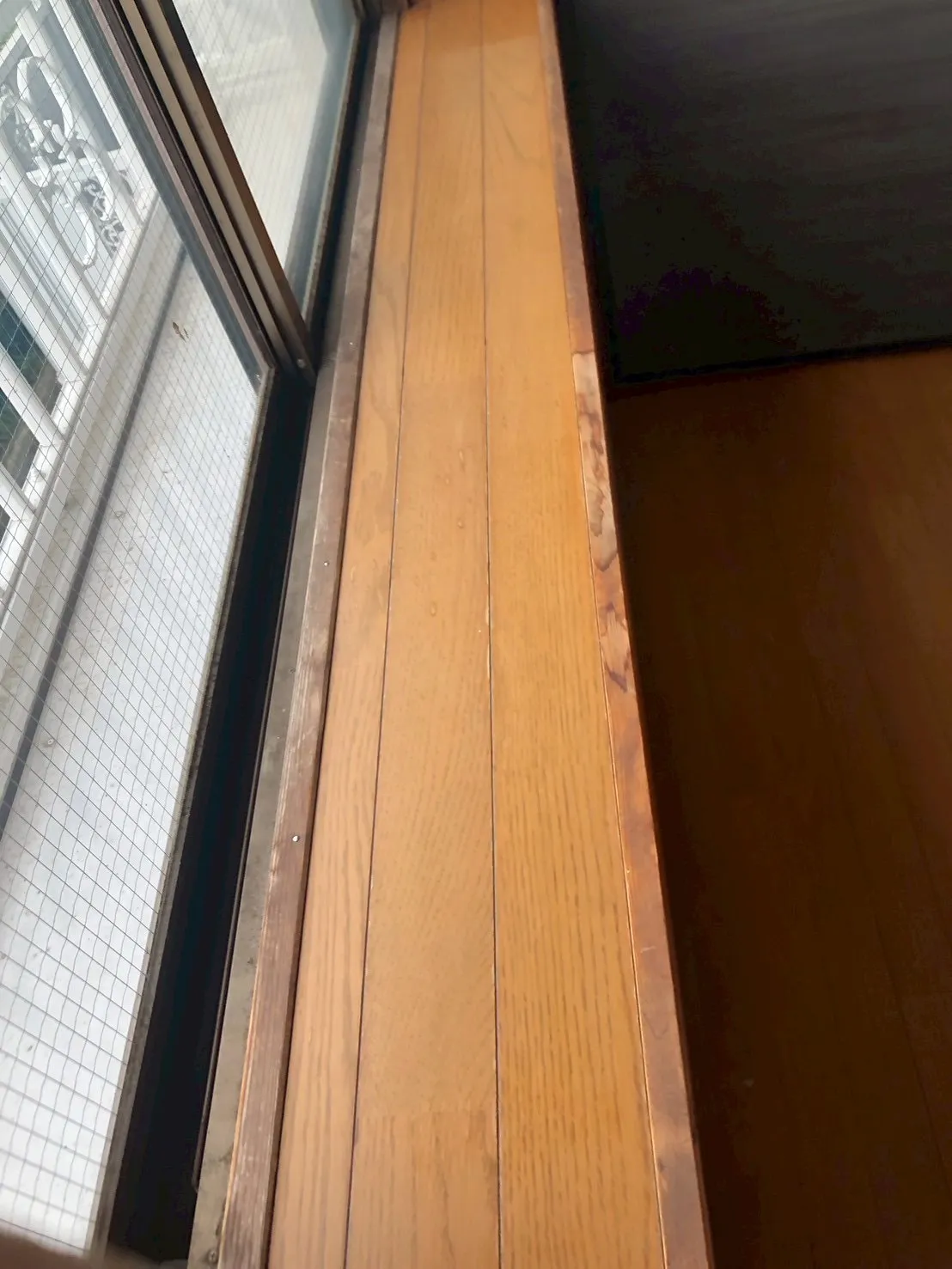 出窓の木枠下部。シングルガラスということで結露が主な原因かと思われ